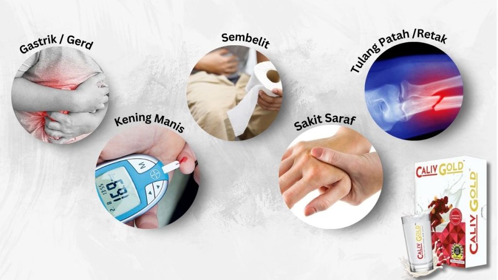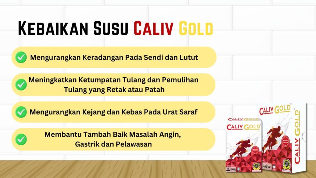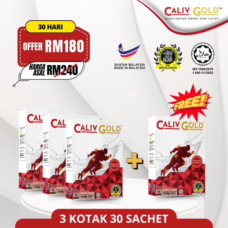 CALIV GOLD adalah serbuk minuman pracampuran gabungan TUJUH (7) BAHAN SEMULAJADI dan diformulasikan dengan manfaat kesihatan 100% sumber semulajadi yang berkualiti dan berkhasiat tinggi. CALIV GOLD dirumus khas untuk bantu kawal dan kurangkan sakit SENDI & LUTUT tapi boleh juga untuk mereka yang ada sakit lain seperti SEMBELIT, GASTRIK, GOUT, 3 SERANGKAI, SARAF & TULANG.