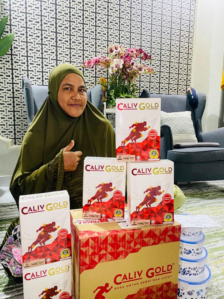 "Lutut dah mula kurang rasa sakit. Sekarang suami dan anak pun minum sebab rasa Caliv Gold ni memang sedap."